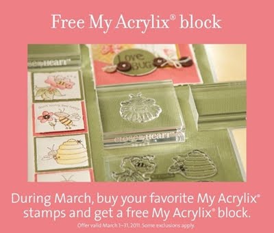 Offer valid March 1–31, 2011. Limit one free My Acrylix® block per order per customer. Qualifying stamp purchases include A-, B-, C-, D-, and E-size stamp sets, including Stamp of the Month sets purchased at full price or at a discount. K-size stamp sets, Stamp of the Month sets earned for free, and Workshops on the Go™ kits are excluded. Close To My Heart reserves the right to substitute a block of a similar size or price.